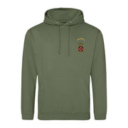 Twin needle stitching detailing. Double fabric hood with self coloured cords. Kangaroo pouch pocket. Ribbed cuffs and hem. Regiment logo embroidered on left breast.