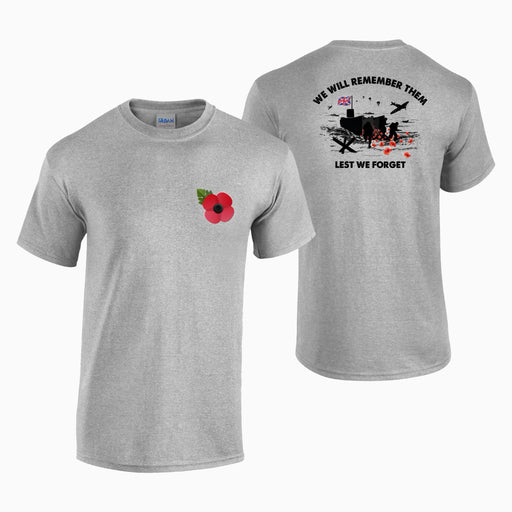 Poppy Left Breast Print Lest We Forget Backprint 100% cotton pre-shrunk jersey. Seamless collar. Double needle topstitched neckline. Taped neck and...